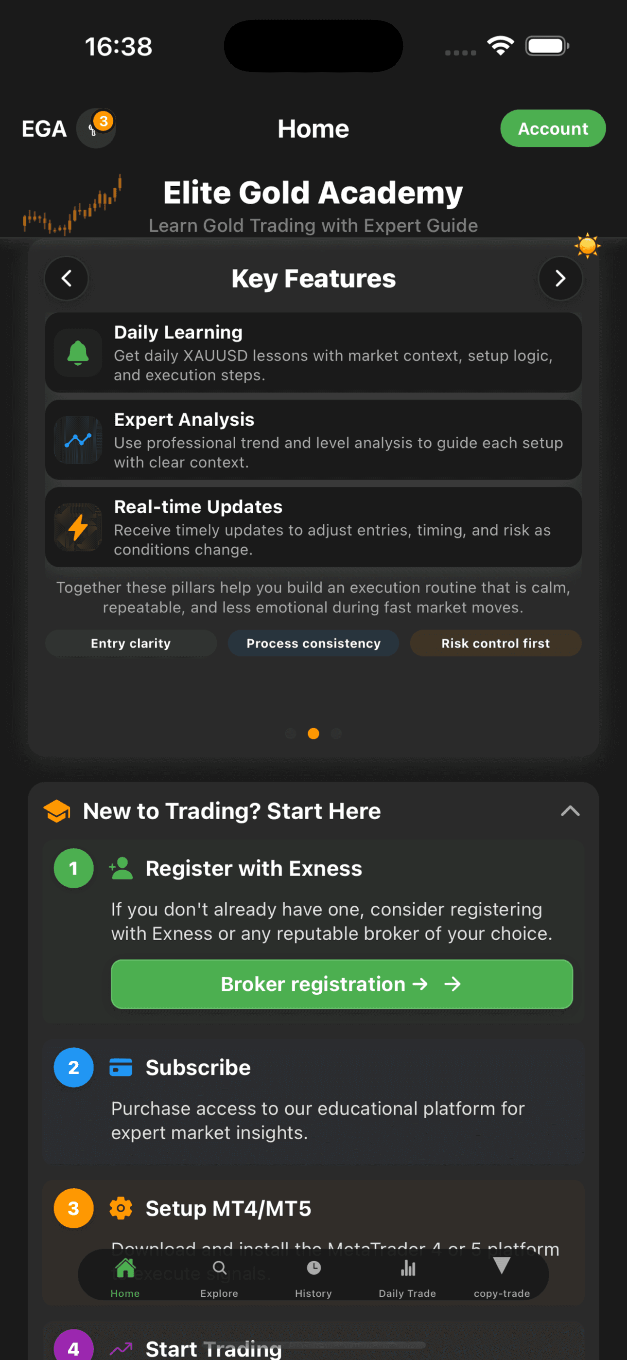 Download Elite Gold Academy, create your account, and unlock the copy trade onboarding flow.
